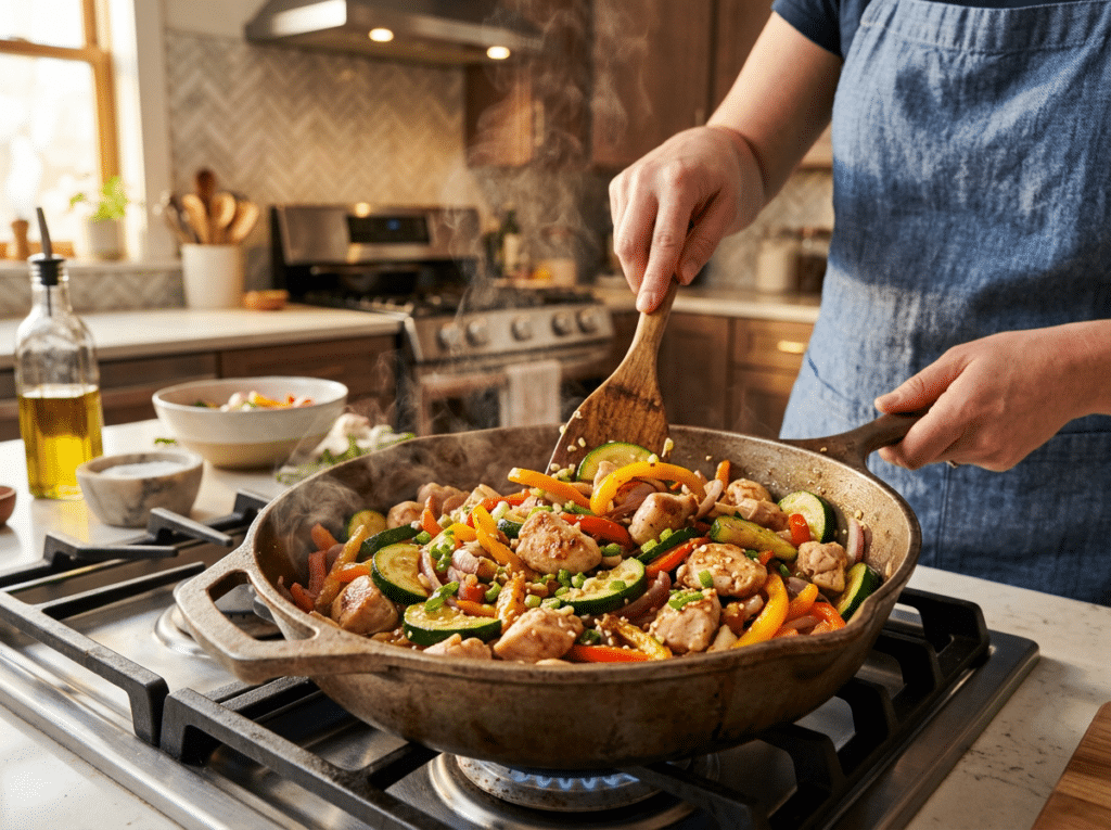 It includes chicken breast, zucchini, bell peppers, low-sodium soy sauce, and sesame oil. Everything can be cooked in one pan and divided into portions for convenience. This meal is low in calories, high in protein, and gentle on digestion, making it a great fit for GLP-1 users.