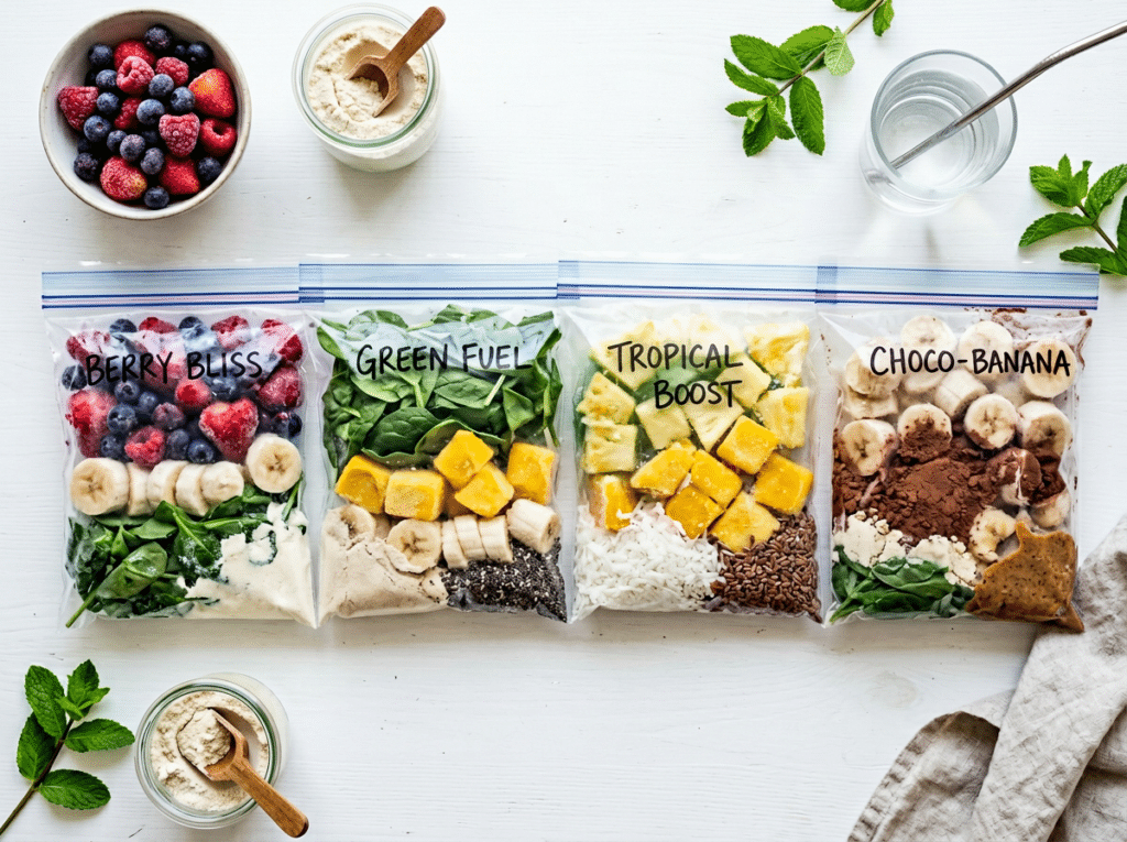 Each pack can include protein powder, frozen berries, spinach, and banana slices, with almond milk added when blending. Simply portion the ingredients into freezer bags ahead of time and blend when needed. This option is ideal for maintaining nutrition on days when solid meals feel like too much.