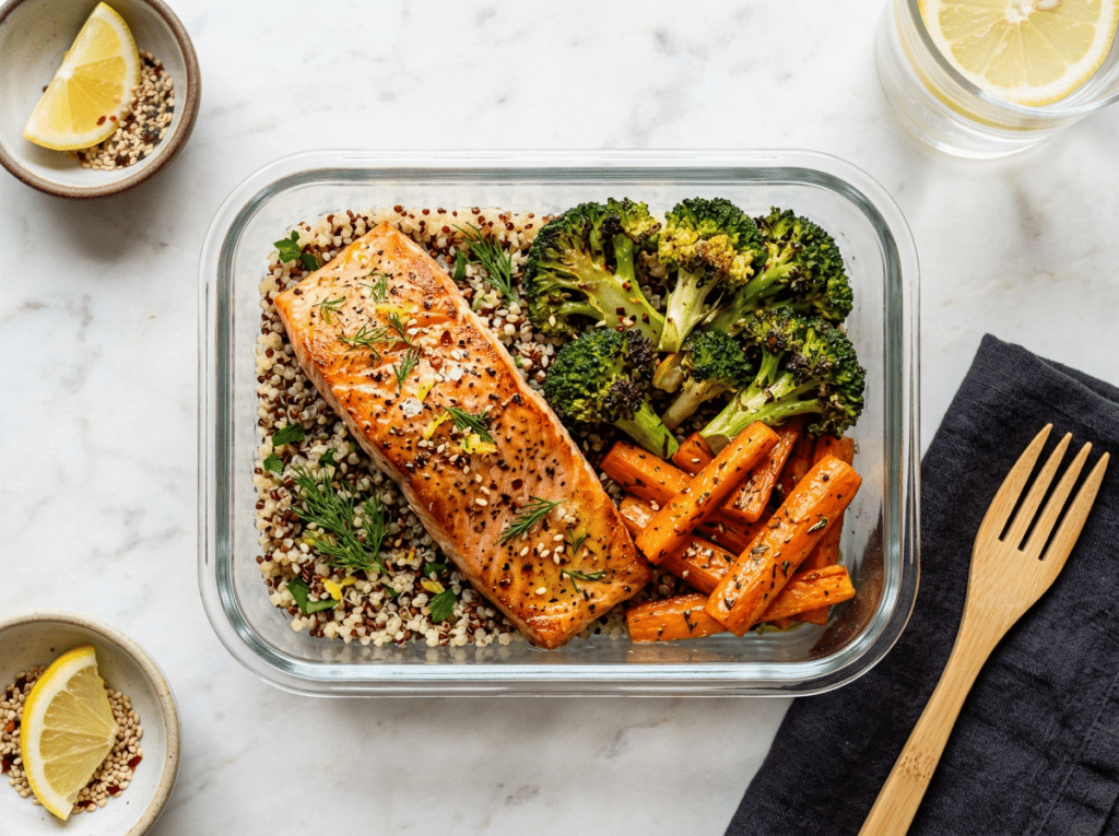 The meal includes baked salmon, quinoa, roasted broccoli, carrots, and a light drizzle of olive oil. Prepare by assembling into individual containers and storing in the refrigerator for up to four days. This meal works well because it combines lean protein, healthy fats, and slow-digesting carbohydrates to support steady energy levels.