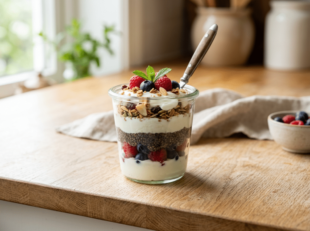 They include plain Greek yogurt, fresh berries, chia seeds, and a small amount of granola. Layer the ingredients in jars or containers for a convenient grab-and-go option. This choice works well because it provides protein and probiotics along with a touch of natural sweetness.