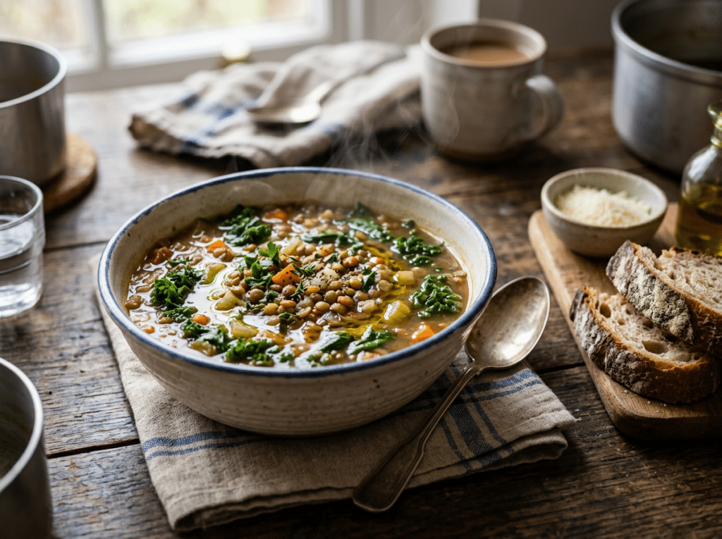 The soup includes lentils, carrots, celery, spinach, tomatoes, and herbs. It can be prepared in a slow cooker or on the stovetop and then portioned out and frozen for later use. This meal works well because it is high in fiber, nutrient-dense, and easy to digest when served warm.