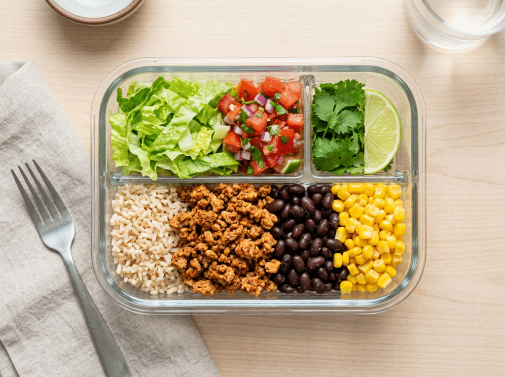It includes ground turkey, black beans, brown rice, corn, shredded lettuce, and salsa. Prepare by cooking the base ingredients in bulk and storing toppings separately until ready to eat. This dish is satisfying without being heavy and provides a strong combination of protein and fiber.