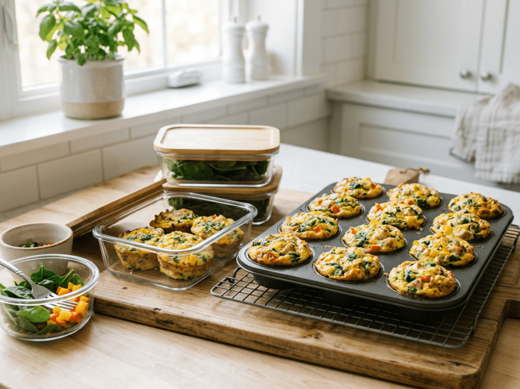 Ingredients include ground turkey, eggs, spinach, bell peppers, and shredded cheese. To prepare, bake the mixture in muffin tins and store them in the refrigerator or freezer for easy reheating throughout the week. This option works well because it is high in protein and easy to portion, making it ideal when appetite is reduced.